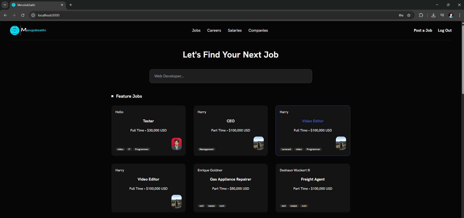 MeroJobSathi is a full-stack web application developed to simulate a real-world job search and recruitment platform. Built with Laravel (PHP), MySQL Database and styled using Tailwind CSS, the project showcases user authentication, job posting, employer-user relationships, and dynamic job searching functionalities.